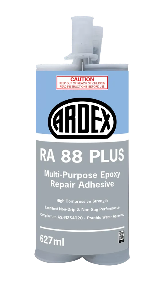 RDEX RA 88 Plus is a two-component, high-performance ceramic blend epoxy. No-drip, non-sag, repair adhesive perfect for horizontal, vertical and overhead use (trowel able). Fast cure time (approx. 2 hours) and when cured, over twice as strong as standard concrete.